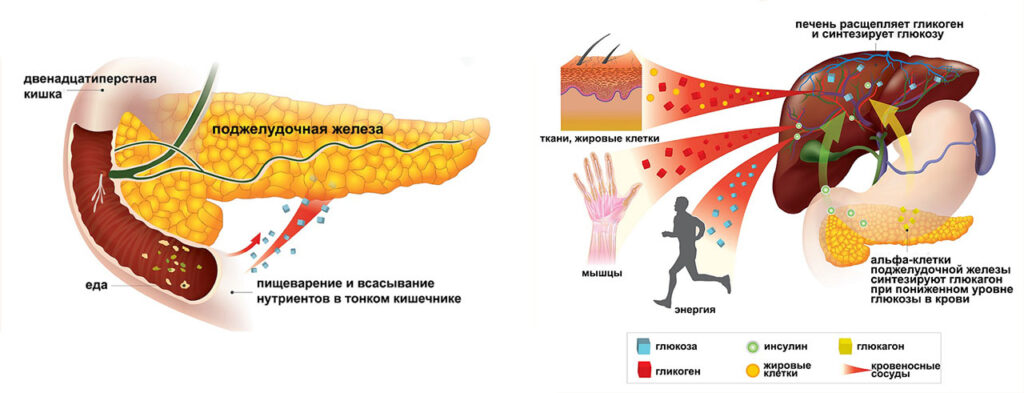 Освобожденная из пищи глюкоза попадает из кишечника в кровь. Поэтому через некоторое время после приема пищи уровень глюкозы в крови у любого человека, даже в норме, повышается.